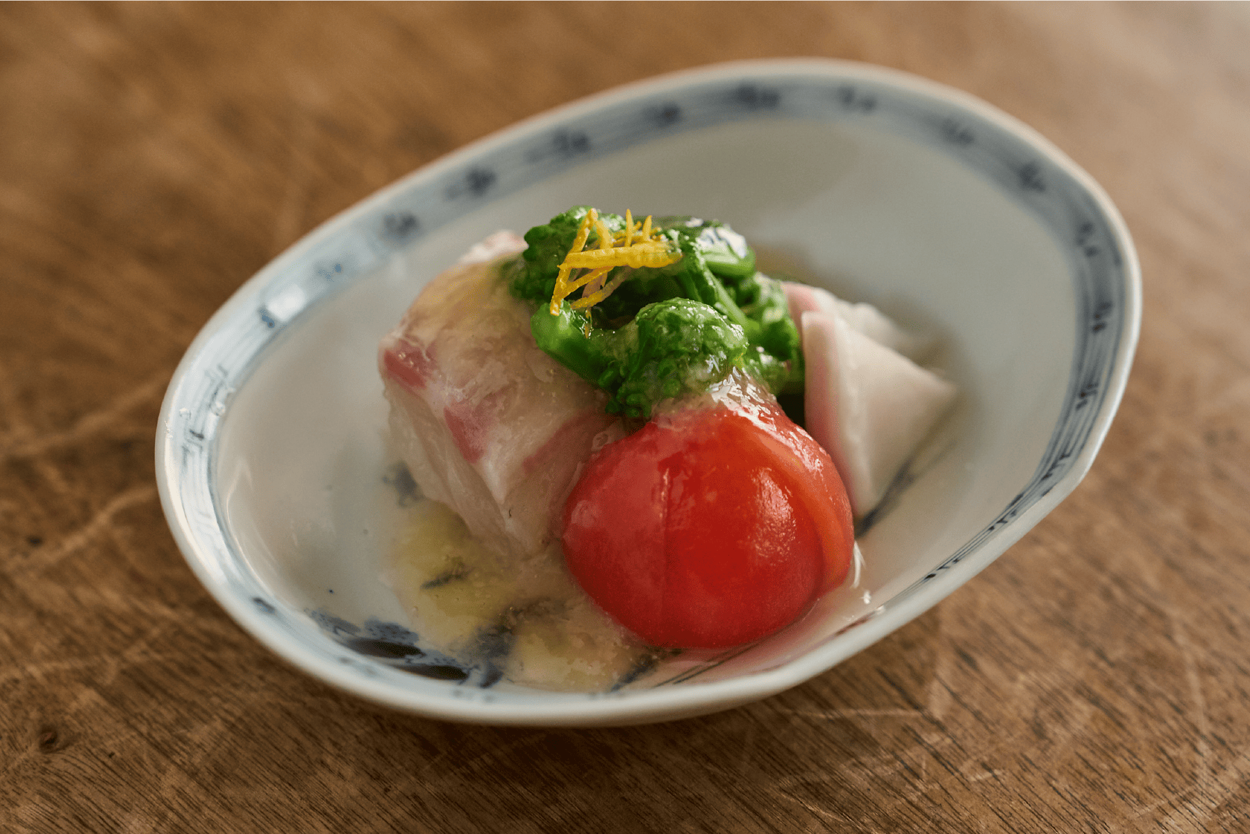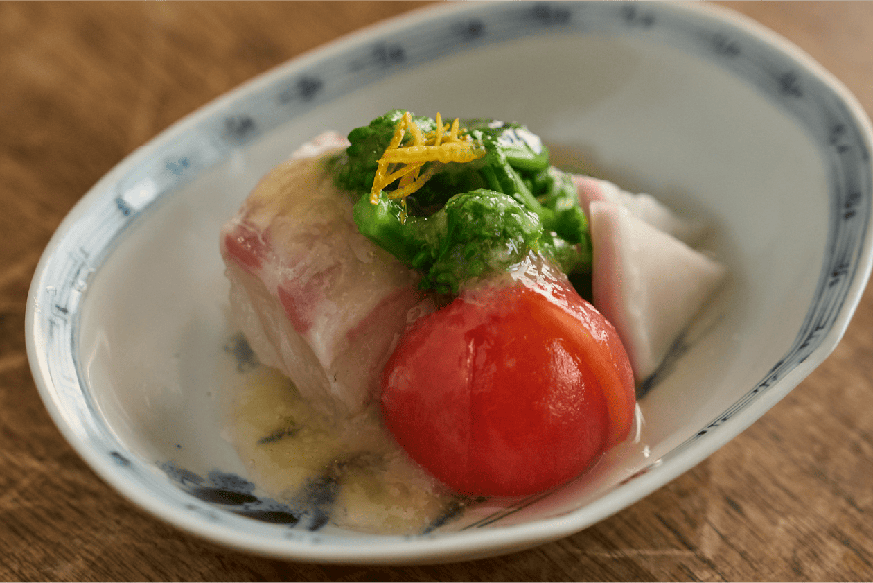 菜の花のほろ苦さに、昆布で旨味を引き出した鯛(玄界灘/福岡県産)、そして瑞々しいトマト。